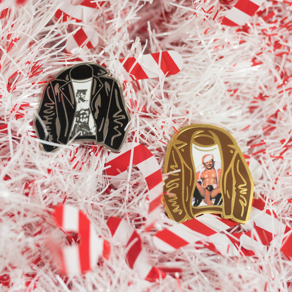 Our #1 selling Leather Jacket pin has been reimagined for the holidays as a perfect stocking stuffing, Santa Daddy!