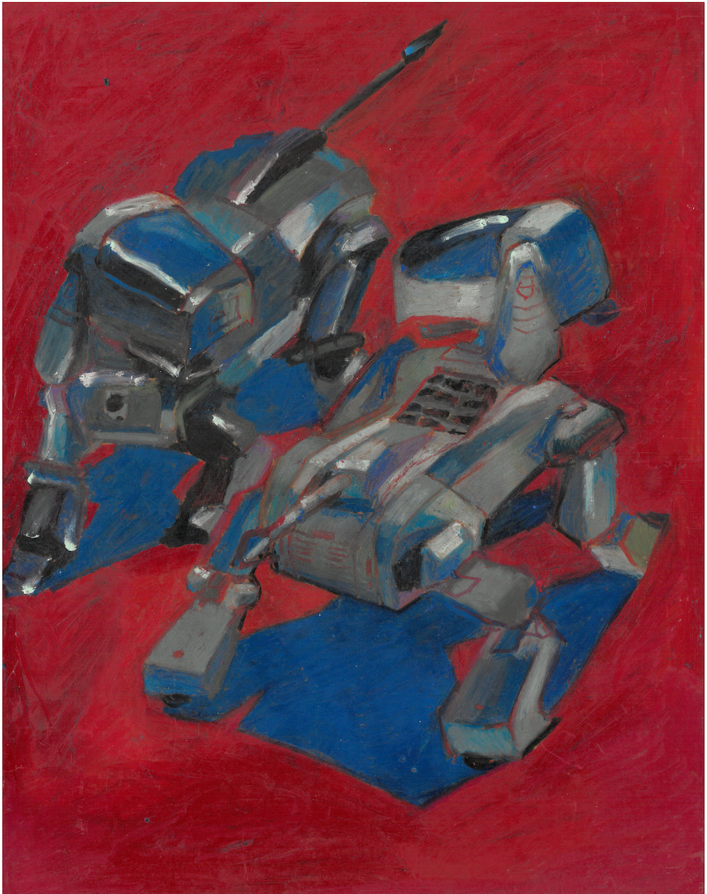 Bo is a multidisciplinary artist based in Halifax. His artistic development has primarily been independent, with some previous formal art education. His body of work can be divided in two sections based on digital or analog mediums. A current passion of Bo's at this time is an interest in robot dogs. This exploration is largely done through oil pastel and/or gouache "portraits", but is also explored in the digital half of his body of work; a project known as DESKTOP DOG. The application of "dog" as a metaphor for the design and intended use of these robots is one that reflects his experiences in a number of ways. Gender identity, the artmaking process, interpersonal relationships, and beyond - he creates representations of these and breaks down personal elements through these dogs."