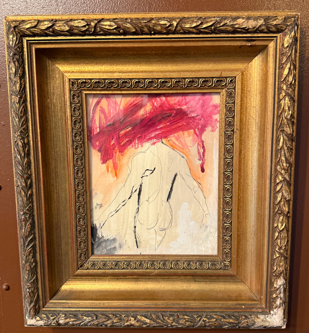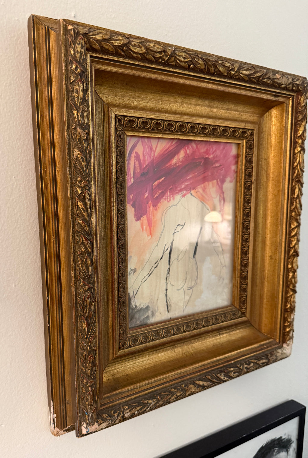 "A self-portrait in spare black lines, the body breaking beneath a streak of furious red paint. It marks the fury and release of a sexual awakening — raw, eruptive, and impossible to hold back — as the artist emerges from the weight of a repressive religion. The ornate 19th-century gilded frame holds the work like a relic, its old-world restraint clashing with the immediacy of the image. That tension becomes the story: a self once confined, now erupting past every boundary."