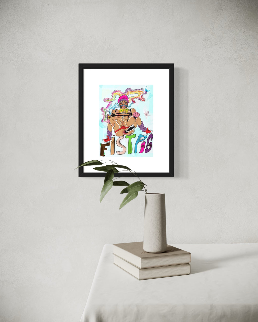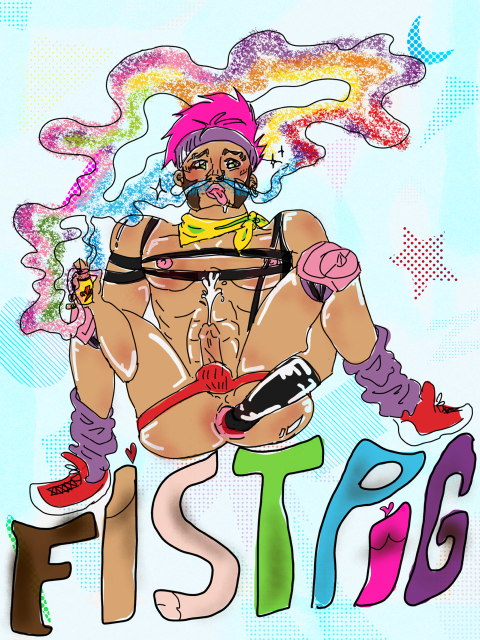 Born in Los Angeles and raised in the San Francisco Bay Area, LA resident 30-year-old Mako Berlin art focuses on sex positivity and the release of shame. Drawing since the age of 3, with a BFA in Graphic Design from Art Center College of Design, he has worked for several years in design and fashion studios, and after assisting and helping with clients and others’ visions has decided to make art under his own name. The art is metaphorically autobiographical; stylistically it is an amalgamation of Eastern and Western influences, having been raised on the west coast by a white father and a Japanese mother and influenced by American and Japanese animation and video games growing up. Employing the tropes and symbols of nostalgia and Americana, old retro gay porn mags and zines, and neon Pantone colors in comic book strips, the drawing combines these styles and adds the influence of Japanese bara manga using surrealism and cartoon-like, exaggerated proportions.