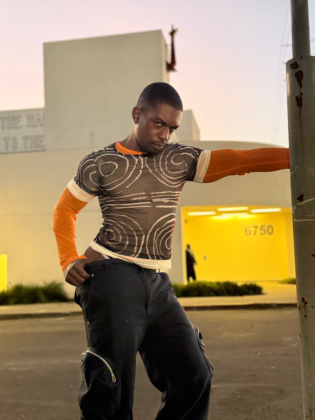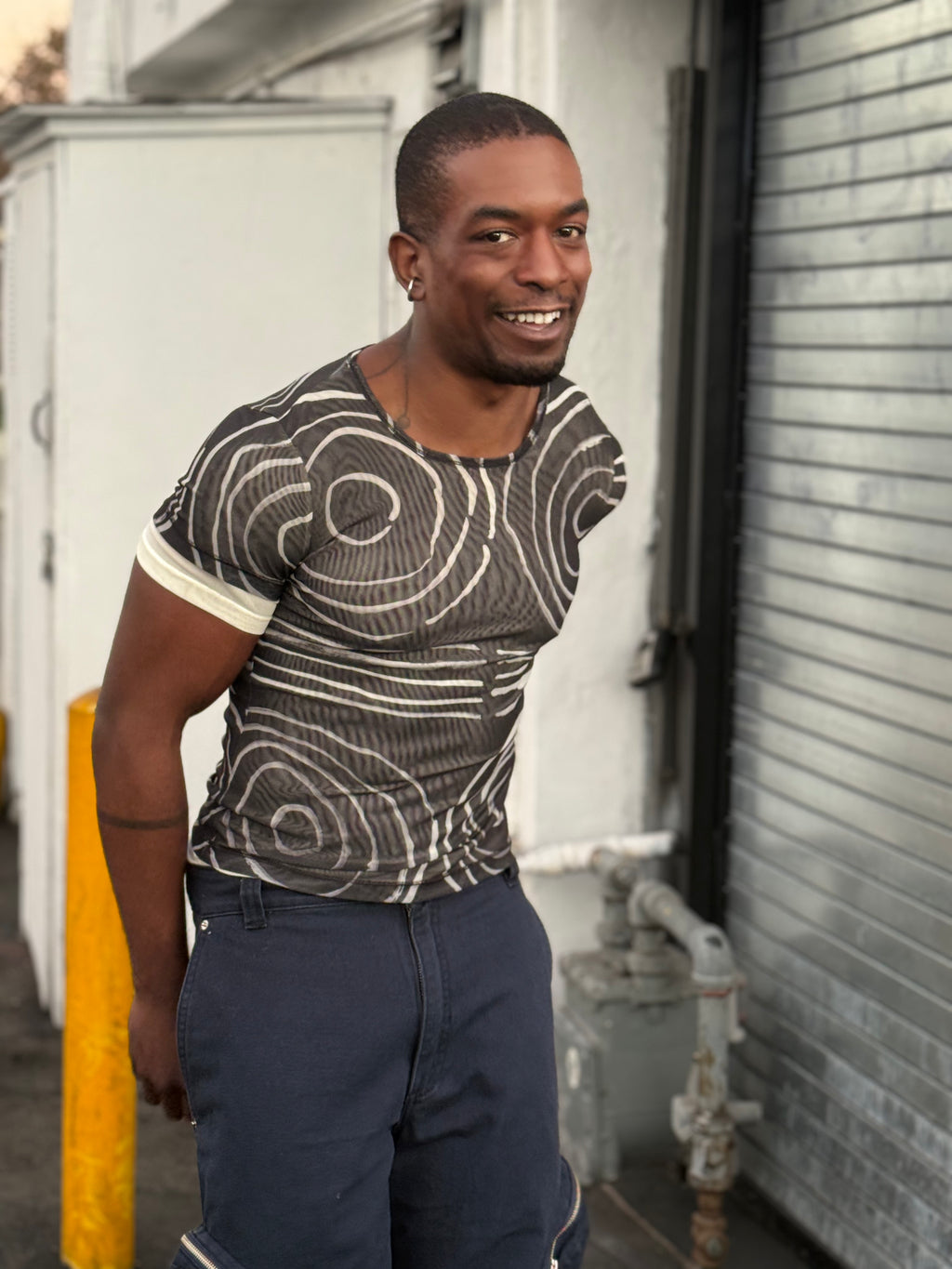 Unisex T-shirt in double-layer digitally printed micro mesh, featuring a distinct all-over print on the top layer and a bottom layer that peeks out from the hem.