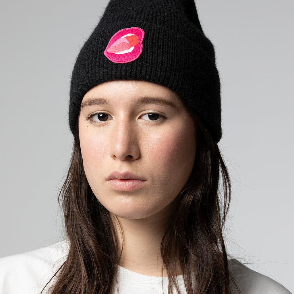This soft, wide-knit black beanie features a woven patch of Tom Wesselmann’s Mouth #7 on the front of the cuff of the beanie.
