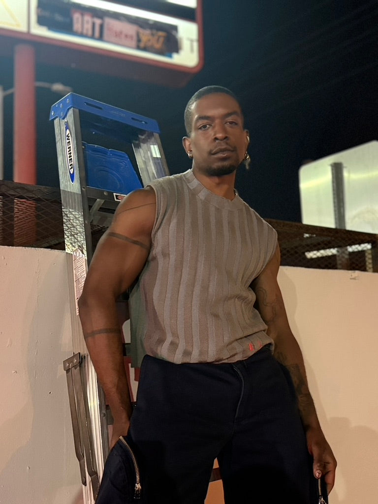 Classic boxy crewneck vest in 100% merino wool with a contrast striped wide rib. Features our new intarsia knit EL logo in red.