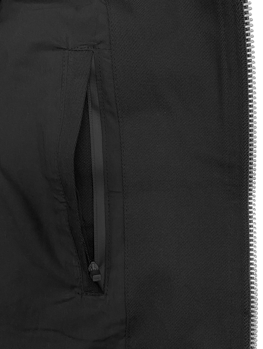 • Hidden zip welt pocket at wearer's left interior, and an open pocket at wearer's right interior