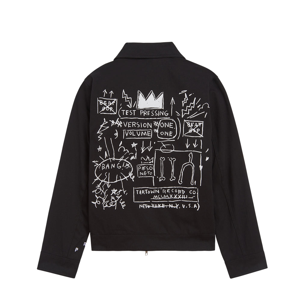 This mechanic's jacket features a bold print of Basquiat's artwork Beat Bop on the back of the jacket. On the front, you will find Basquiat's own signature embroidered at the front pocket and the RPO logo above the cuff on the in white thread on the left side.