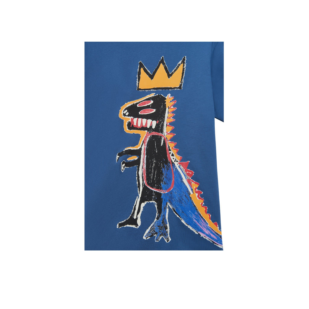 This medium weight cotton T-shirt features Basquiat’s Pez Dispenser across the front—with the dinosaur’s tail wrapping around the side and extending to the back of the shirt. The bottom right of the shirt features a sewn-in woven tag with handwritten text pulled from one of Basquiat’s famed notebook pages.
