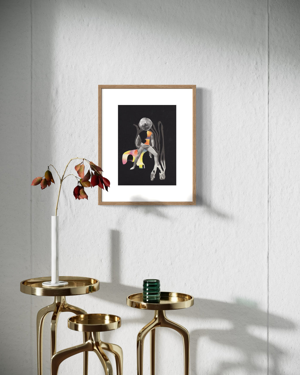 David’s work serves as a vehicle for exploring fantasy, often taking the form of dreamlike, moody compositions. He draws inspiration from vintage imagery—particularly from male physique magazines—and layers these elements with textures and patterns to evoke a sense of movement. His process is intuitive and cinematic; each piece feels like a still from a film, suspended in time and rich with tension. As a viewer, you’re left with a sense of ambiguity—uncertain about what’s happening or what might unfold next.