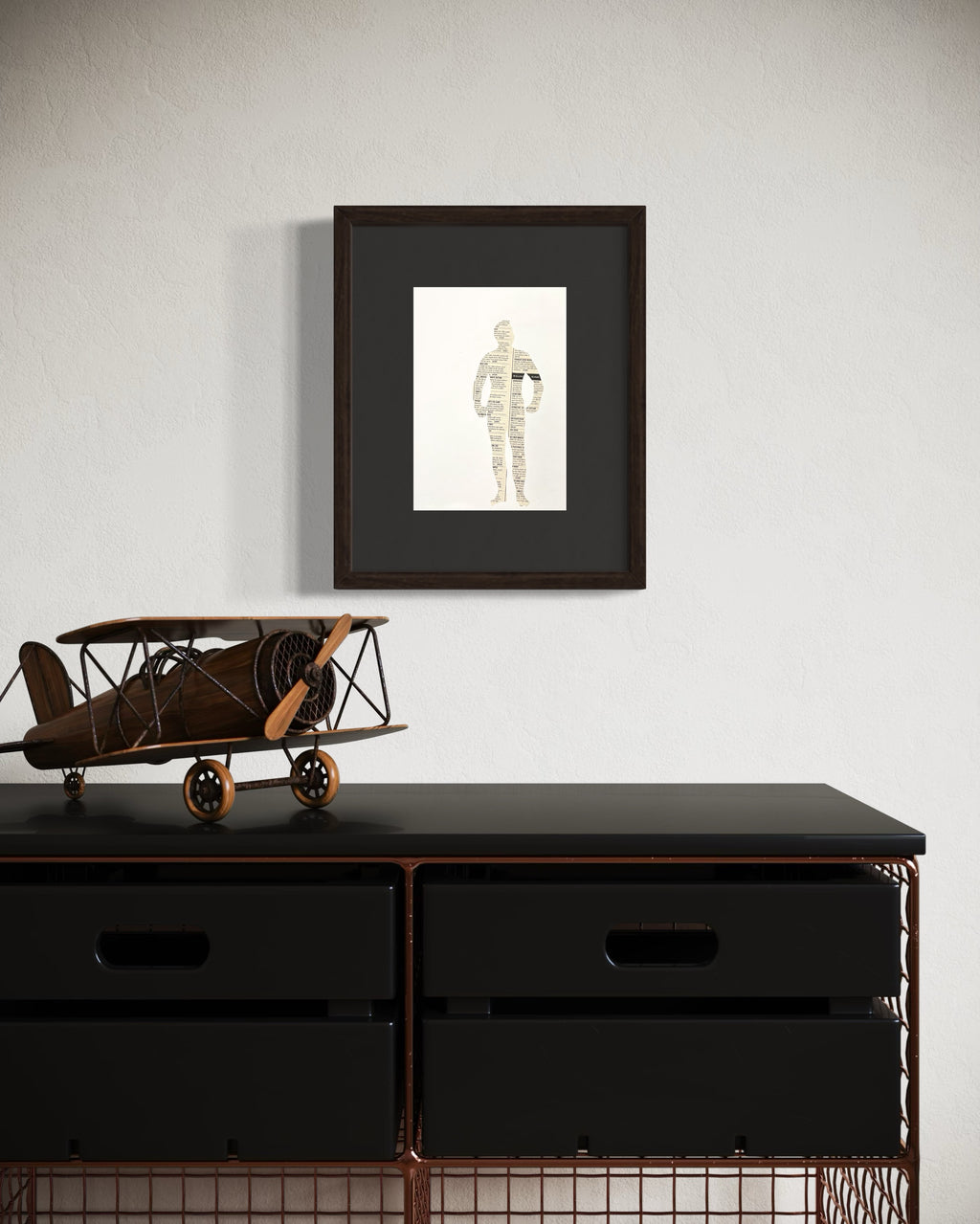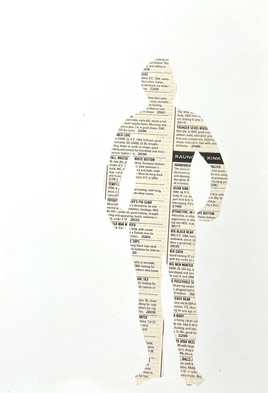This male figure represents the artist's reminiscences of the DISCO ERA (1970-1980). This is a portion of a series called “new boys” of erotic collages. The text within the figures, derives from erotic magazines of that era, when meeting men was only possible through personal ads or in bars. That decade predates the scourge of HIV-AIDS that so severely impacted the GAY community. So, these figures are evocative of those years, during which sex with men was relatively carefree and without dire consequences
