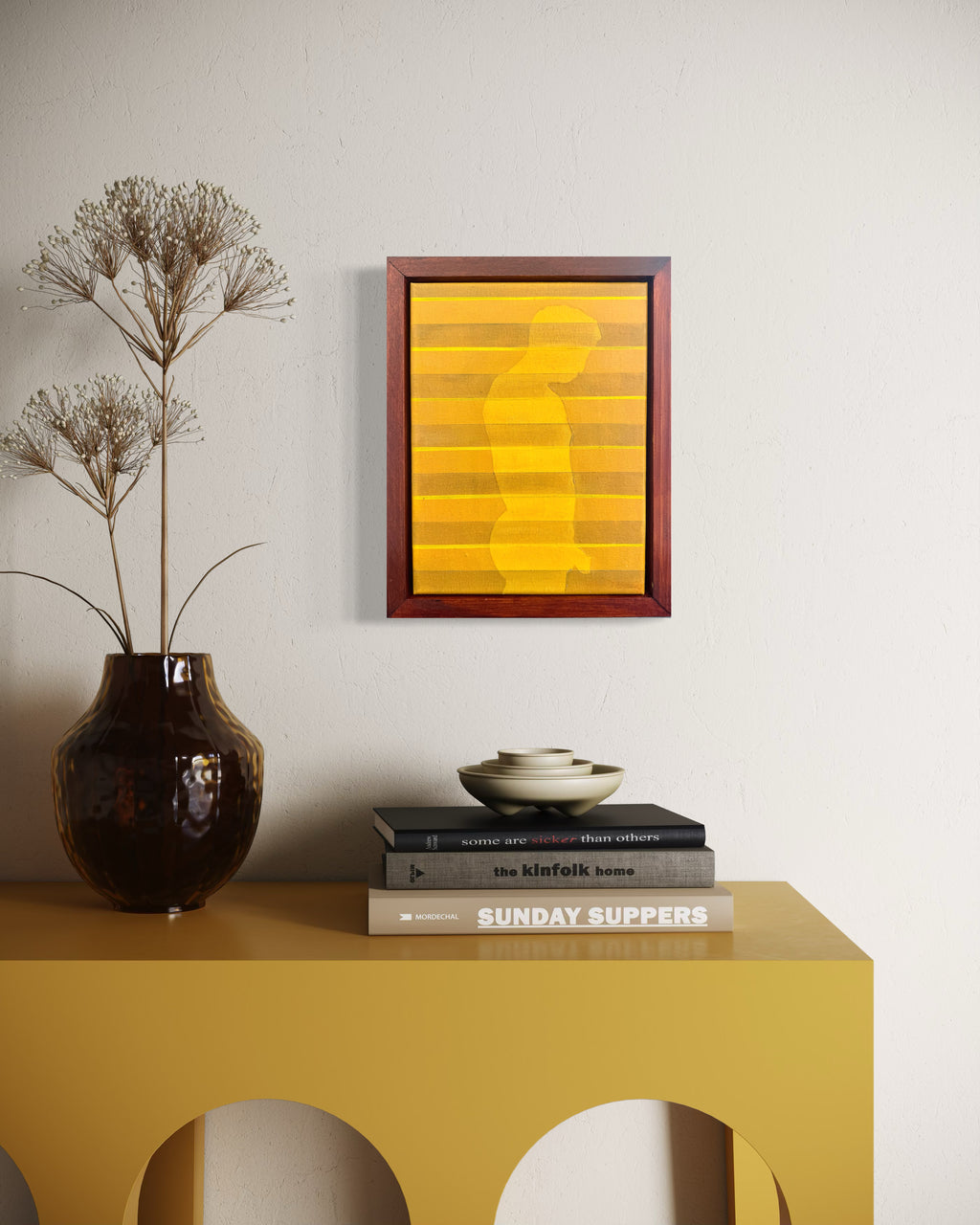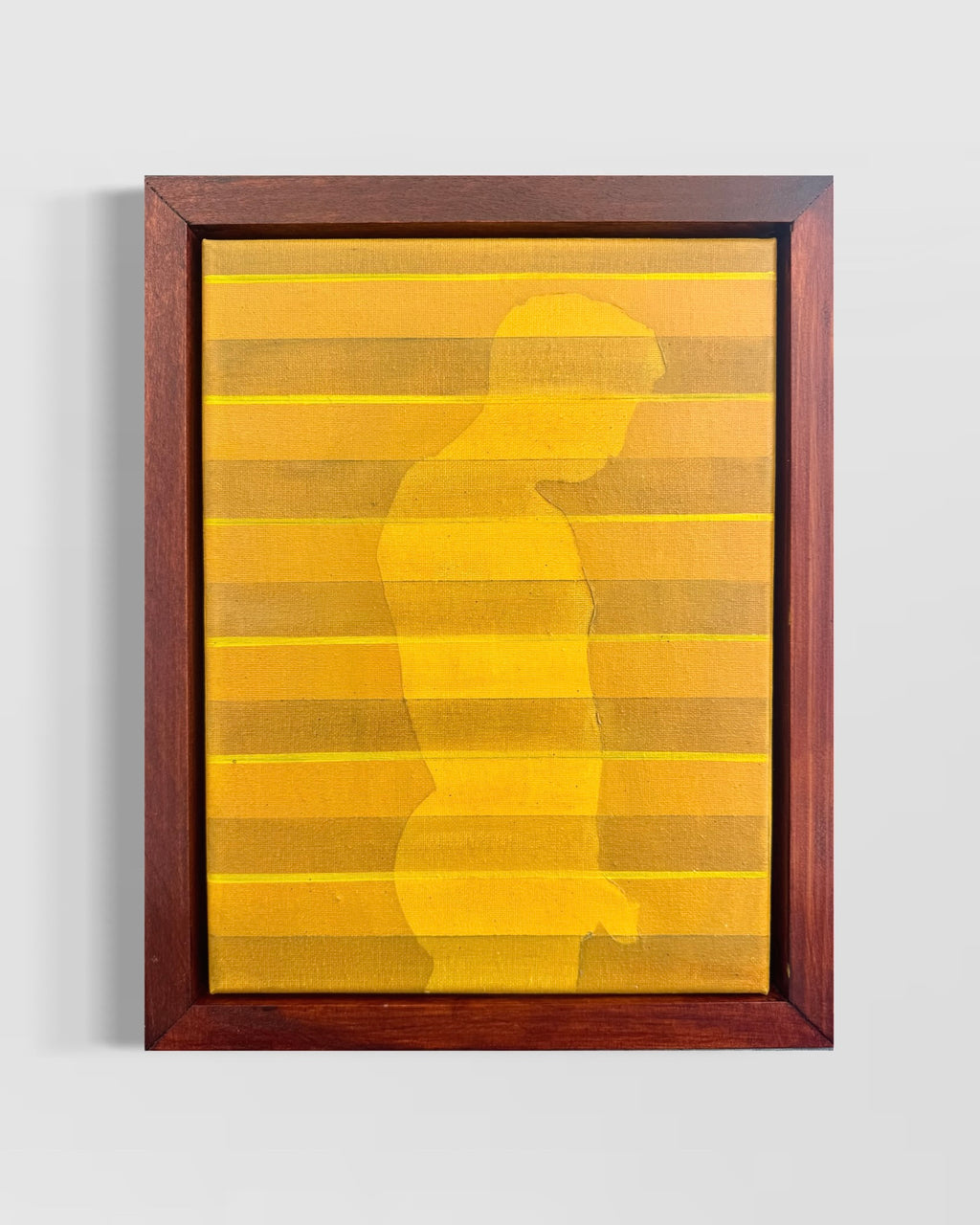 This oil painting was created using a masking technique, where the artist created shapes and figures out of painters tape, that were applied to the canvas, painted over multiple times and then removed after the paint dried. The remaining shapes on the canvas show the shadow of a male figure seen through vertical lines, almost like the blinds of a window.
