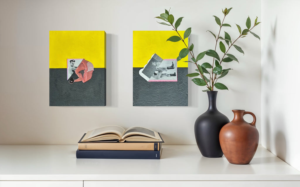 Collage painting on wood that juxtapose fluid, organic shapes with vintage male imagery, exploring the space between intimacy and form.