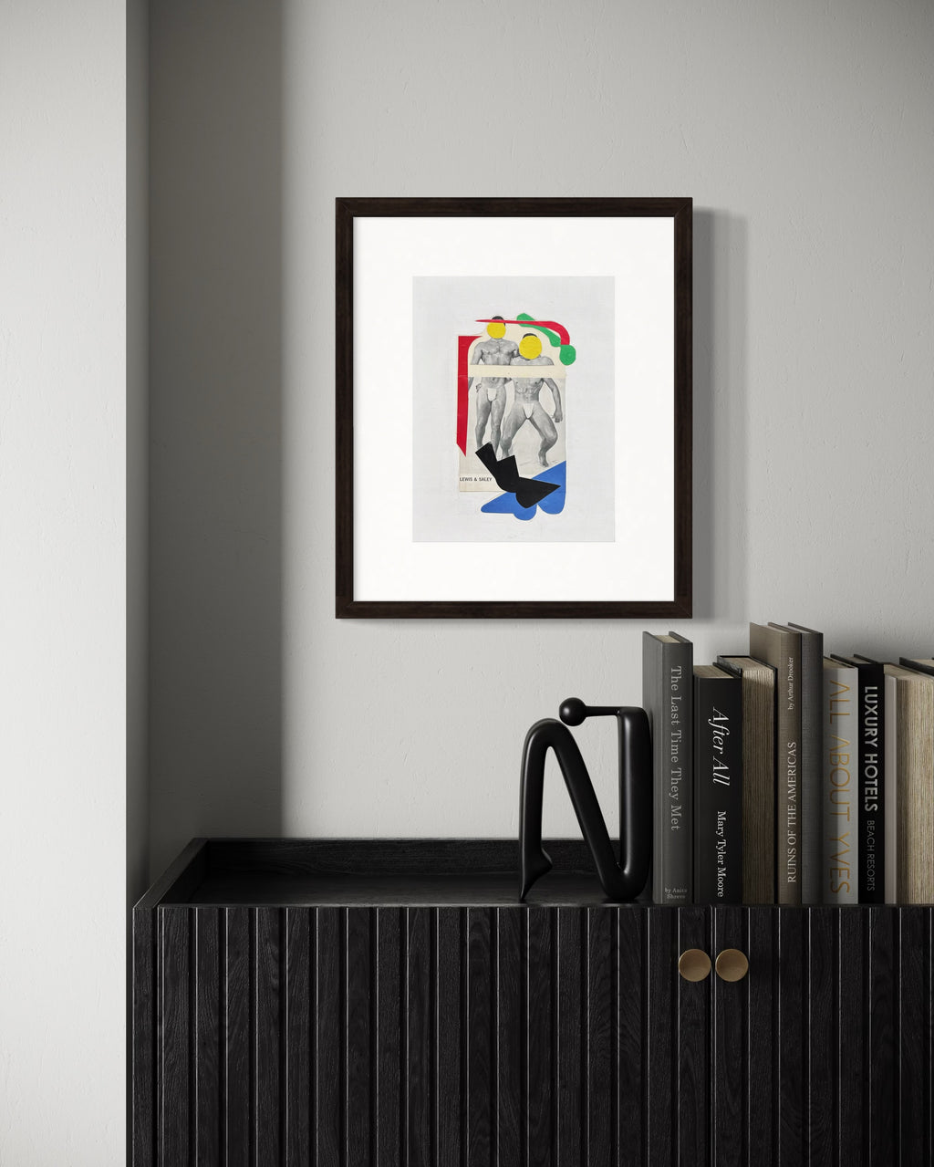 Collage painting on wood that juxtaposes fluid, organic shapes with vintage male imagery, exploring the charged space between intimacy and form. Created specifically for CultureEdit’s Fourth Art Auction, this piece is part of a  mini-series inviting viewers to consider how structure and softness co-exist on the same plane