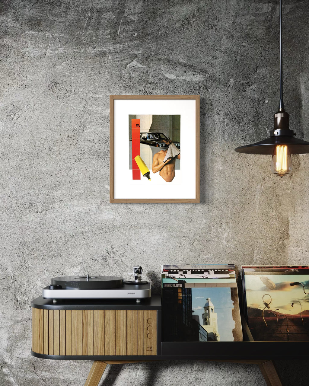 Collage painting on wood that juxtaposes fluid, organic shapes with vintage male imagery, exploring the charged space between intimacy and form. Created specifically for CultureEdit’s Fourth Art Auction, this piece is part of a  mini-series inviting viewers to consider how structure and softness co-exist on the same plane