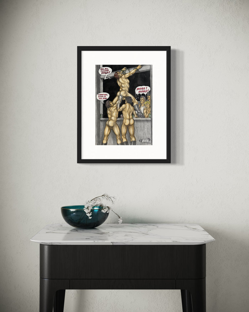 Martin of Holland, next to being S&M pioneer and founder of the notorious and legendary scatparty culture, he was one of the early European post WWII homo-erotic art pioneers. He worked and published together with his friends ; Tom of Finland, Willem Kok and Bastille. Sadly nothing of his early artwork remains ( only pictures ) because it was all confiscated and destroyed by law-enforcement when he was arrested in the mid sixties, days when it was illegal in Holland to produce and distribute such works, although confiscation is still known to happen with not-middle-of-the-road homo-art in ‘tolerant’ 21st century Netherlands. Luckily Martin proved a pinnacle of defiance’s, upon release from jail when the law changed, he restarted drawing immediately with an unprecedented filthy vengeance. For the first time the appointed custodian of his art-heritage, local friends and fellow international promotors of homo-erotic art present the highlights of his oeuvre in a decent and respectable salon-table book, as he would have grinned at. most of his work is in colour but normally published in gay magazines in black and white. Martin of Holland’s art appeals to very specific tastes, and to call it extreme might be a bit of an understatement. His passion for the subject matter and unflinching imagination set him apart from those who crave social approval or critical adulation. In a time when so many new and established Gay and erotic artist are trying to ’tastefully tone it down’, Martin’s work stands apart as both fiercely creative and proudly uncompromised. Though many in his home country are unfamiliar with his works, his impact on one of the most socially progressive countries in the world was profound. As last individual in The Netherlands to be arrested and incarcerated for producing and distributing his own pornography in the 1950s and 60s, the civil rig????? Ramifications of his multiple year imprisonment helped insure that the generations that followed were free from bias and bigotry hidden behind and inside acts of censorship.