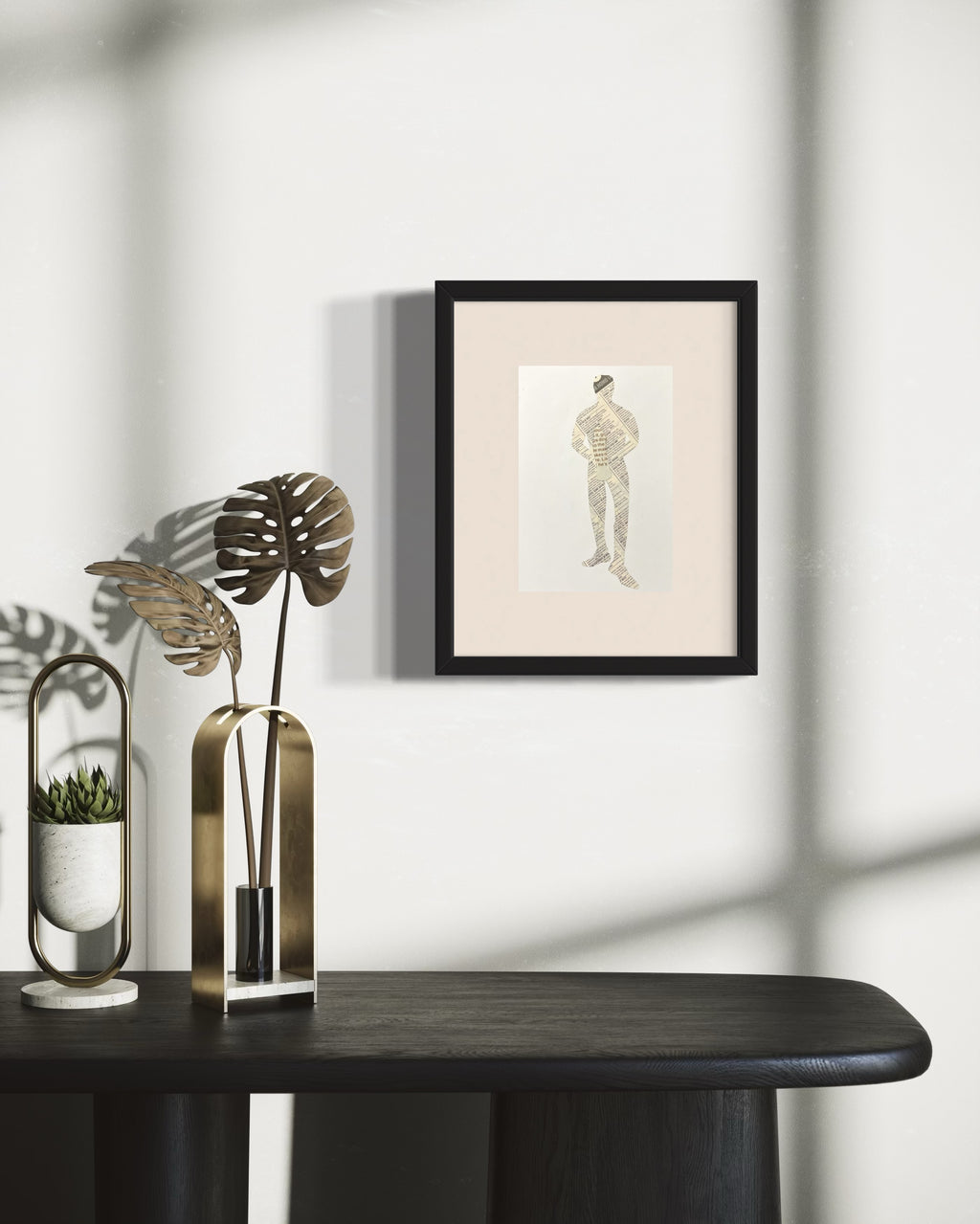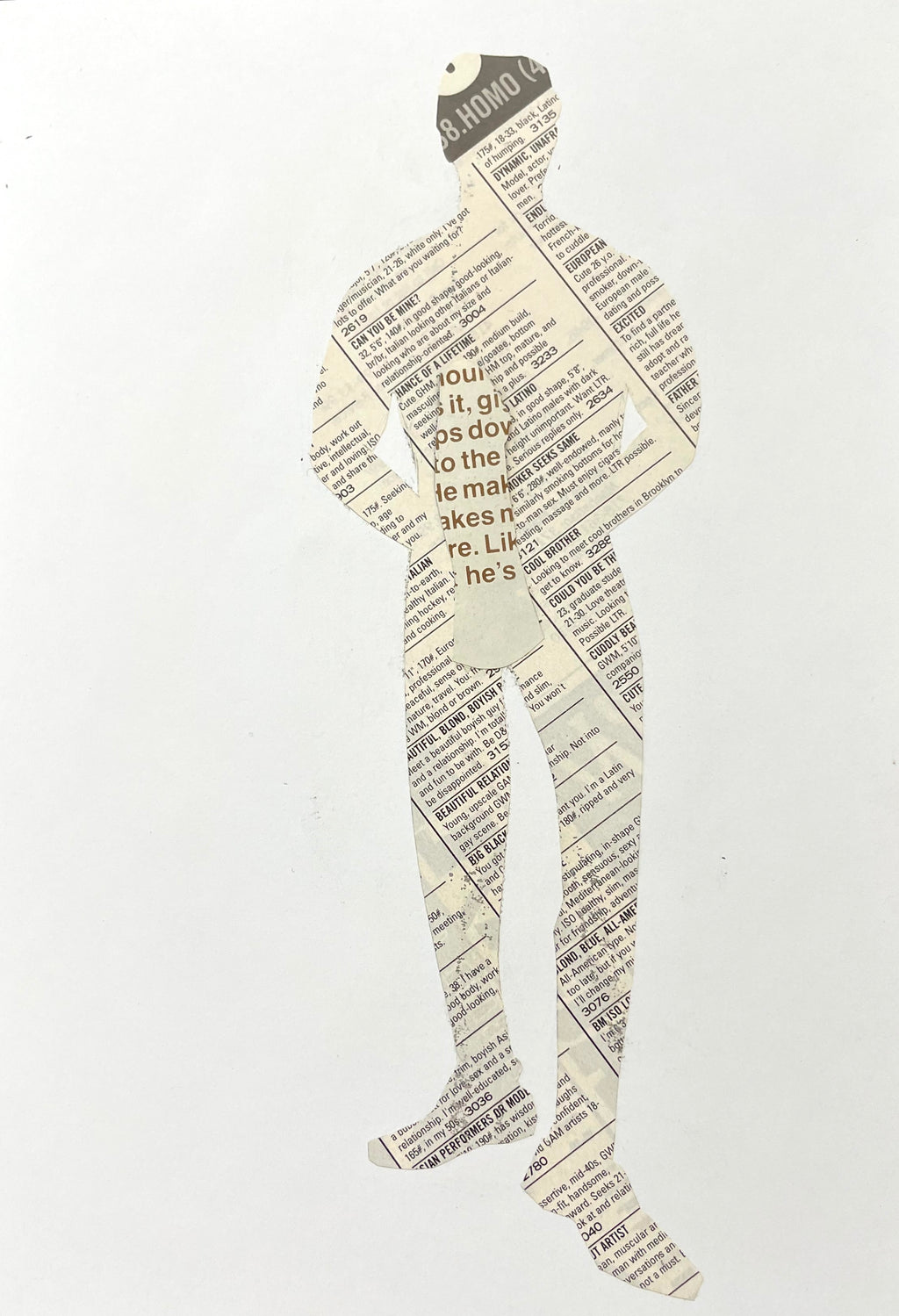This male figure represents the artist's reminiscences of the DISCO ERA (1970-1980). This is a portion of a series called “new boys” of erotic collages. The text within the figures, derives from erotic magazines of that era, when meeting men was only possible through personal ads or in bars. That decade predates the scourge of HIV-AIDS that so severely impacted the GAY community. So, these figures are evocative of those years, during which sex with men was relatively carefree and without dire consequences