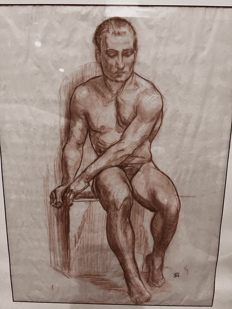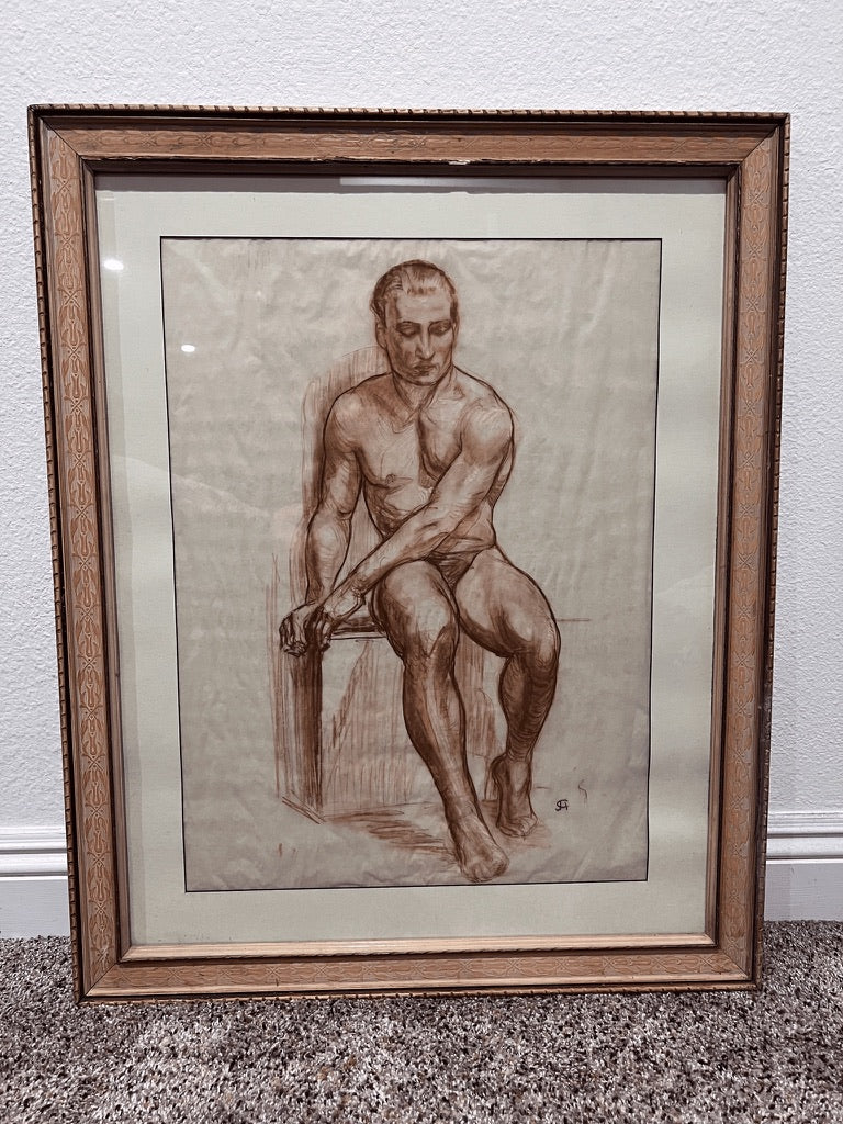 CLYDE ARCHIBALD, American Artist, born 1903. The endless variation of the human figure and the infinite human countenance have fascinated both artists and laymen for ages. Clyde James Archibald explored these subjects almost exclusively for decades in the vibrant medium of pastel. An Oregon native, he was born in Albany in 1903 and was noted early as 1913 by The Oregonian as a “clay artist prodigy.” After the First World War he entered Oregon Agricultural College majoring in engineering, also studying drawing and sculpture under Prof. J. L. Fairbanks. While in Arkansas in the 1930’s Archibald studied portrait and landscape painting under Adrian Brewer. Back to Portland, Oregon, he eventually established himself as a civil engineer. About 1933 he began drawing with the ”Attic studio." The "Attic" was a loosely organized non profit of artists which operated life classes. Such Oregon artist notables that frequented it, and friends of Archibald were Edward S. Quigley, Albert Patecky, Thayne Logan, and Clyde Leon Keller to mention a few. By 1939 the responsibility of running the studio was turned over to Mr. Archibald. They were able to keep this enchanting group going until 1967 when the cost of the studio rental and model wages forced its closure. This ended an important chapter in the art history of Portland. Archibald continued to be active in the Oregon Society of Artists exhibiting elsewhere as well, and winning prizes. He received recognition for this in television and newspaper coverage. Archibald also sculpted historical plaques in bronze which have been placed in various parks and sites in Oregon. Archibald’s most powerful work is found in his portraits of men—images charged with character, intimacy, and quiet allure. His pastel technique brings warmth to skin and complexity to expression, capturing not just bodies, but the magnetism behind them. Signed with his distinctive monogram, each portrait feels like a private moment held still: vulnerable, confident, and unmistakably sensual. For collectors, they offer something rare—male figures portrayed with both strength and desire, created for those who recognise their beauty.