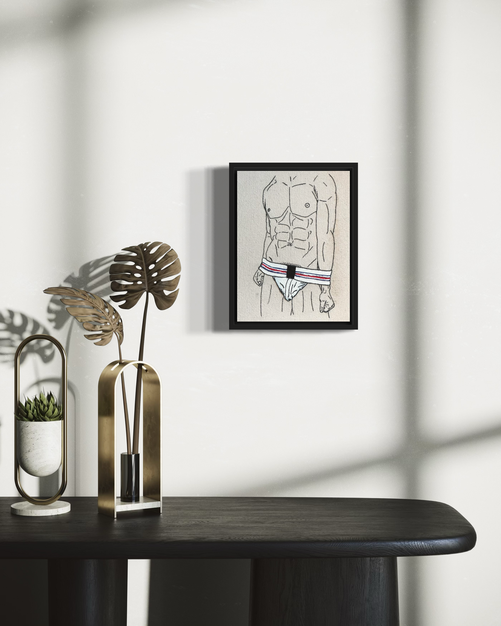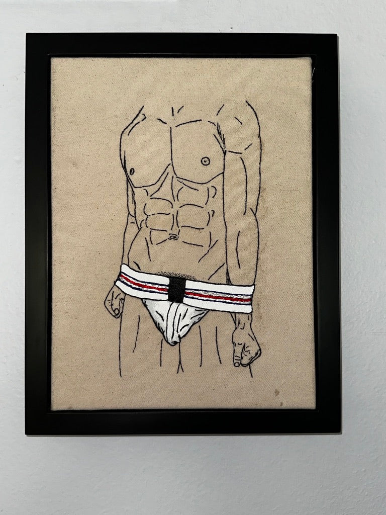 Using cotton and satin thread alongside acrylic paint, the work references classic male physique studies and enduring queer erotic iconography of athleticism. Framed and presented as an intimate object of desire, the piece celebrates the aesthetics of traditional gay visual culture through a contemporary, handcrafted lens.