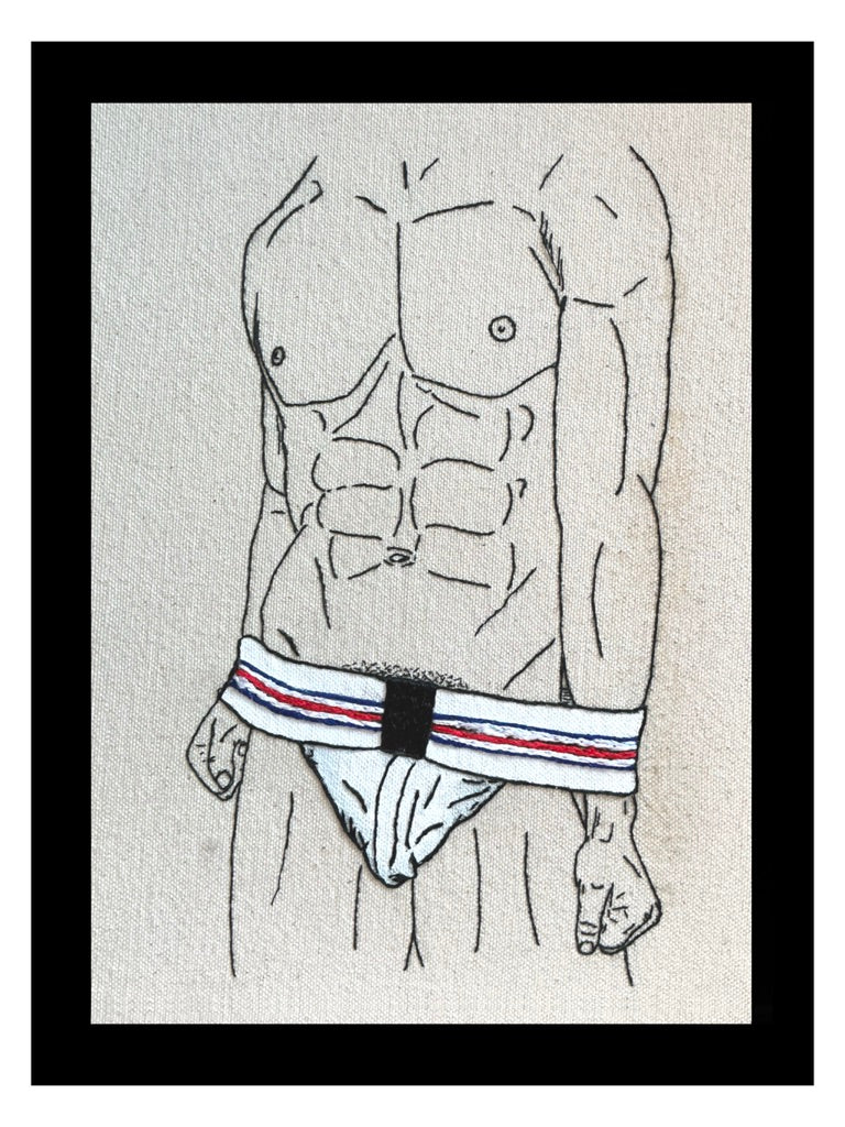 Hand-embroidered mixed-media portrait depicting a cropped male torso in lowered athletic briefs, rendered in black linework on cotton canvas with stitched textile detail.