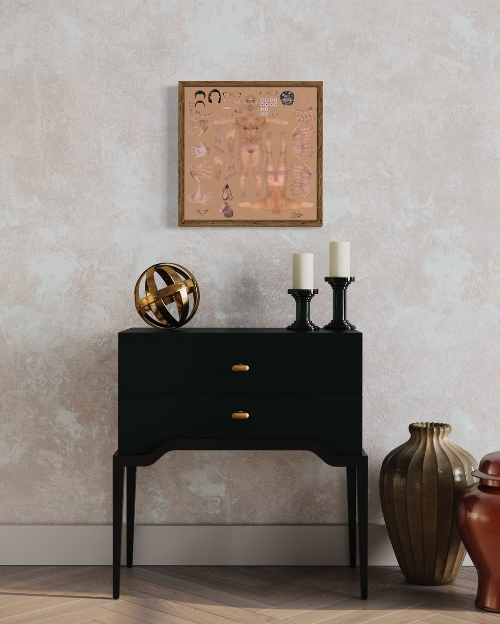 In relation to this, nuevocuerpo.v04 is almost a mockery of the goal for the perfect body, presenting a Do-it-Yourself kit where you match the artist’s own face with the hands, feet, torsos, genitalia, teeth, eyes and eyeglasses of your choice: a strange combination of human skin and hair textures and the more perfect ones of smooth android bodies.