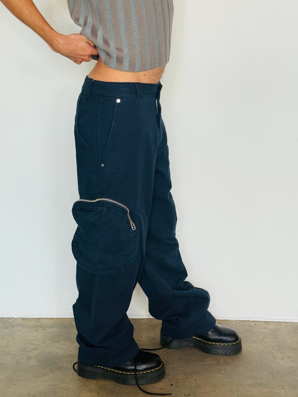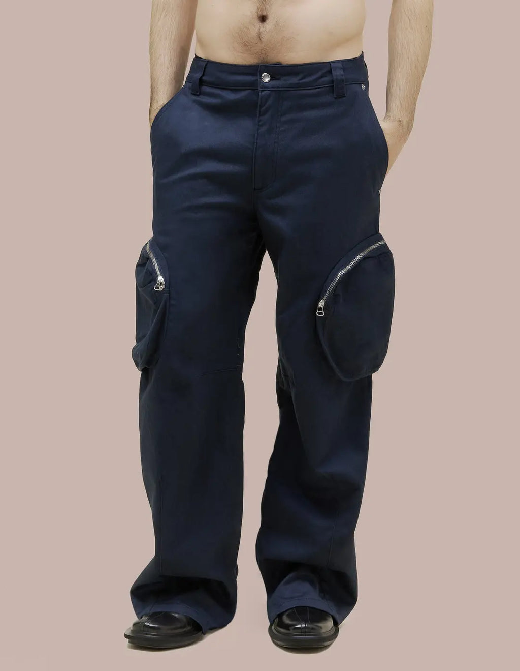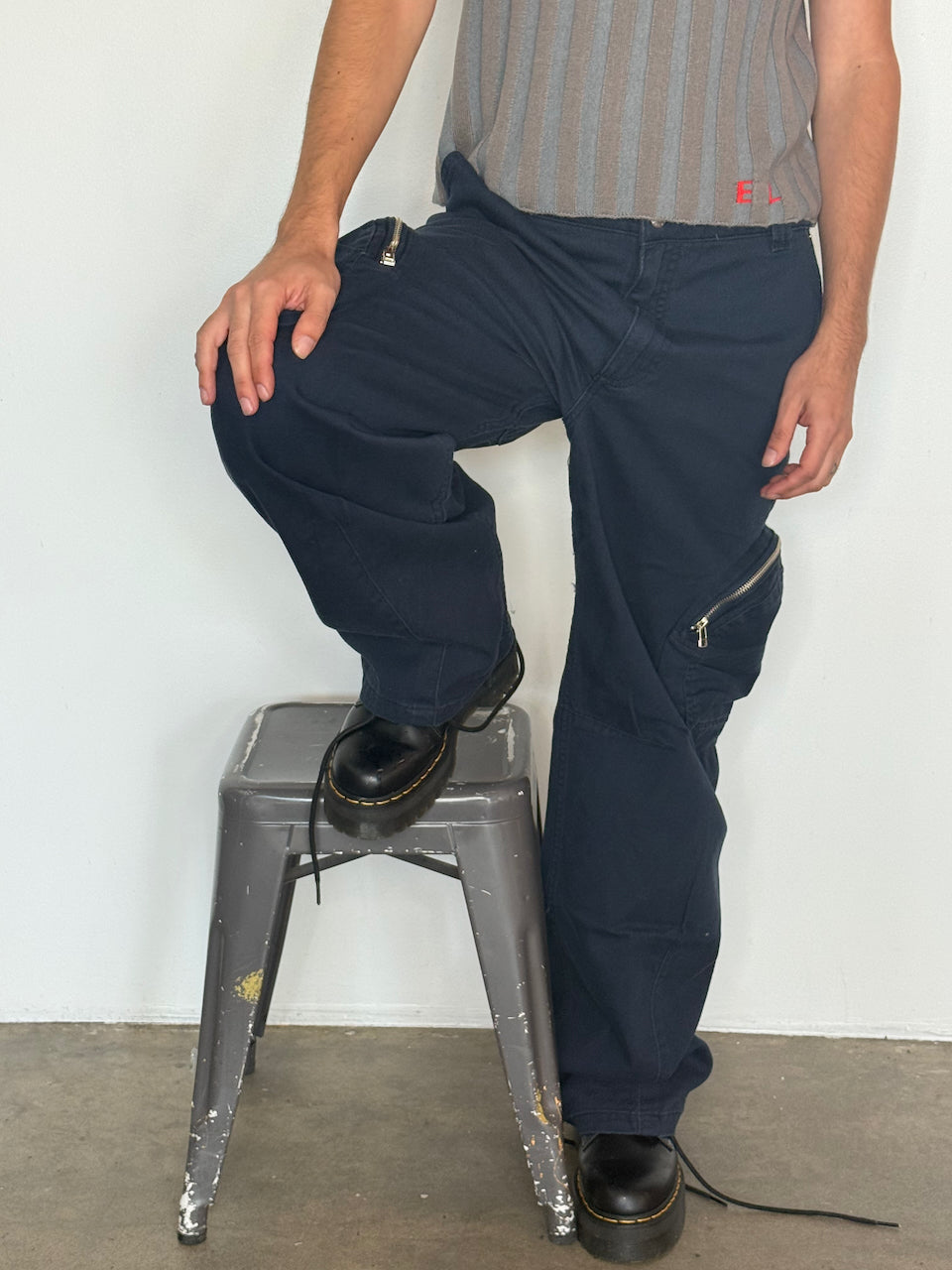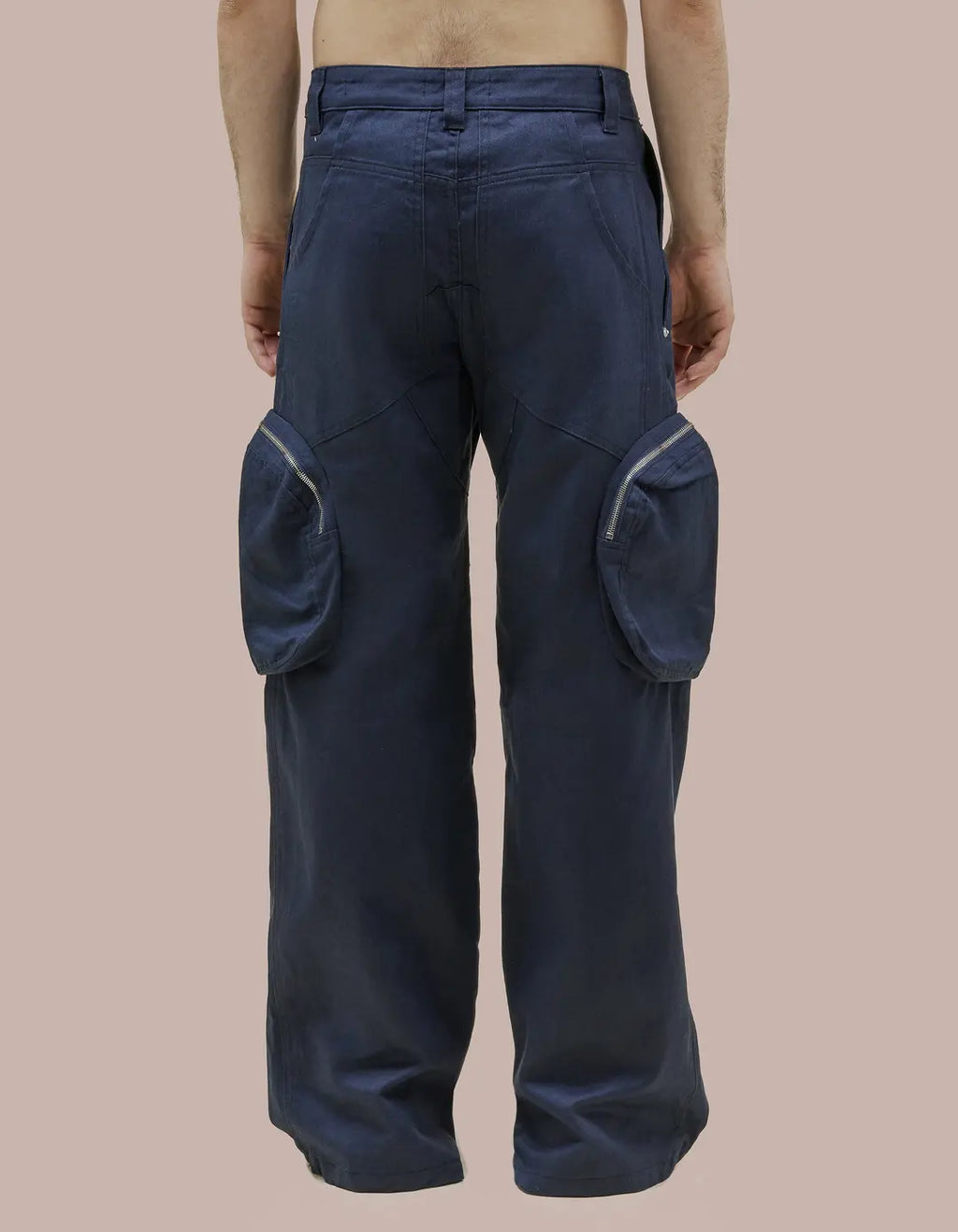 Low-rise with a straight leg, crafted from 9oz Japanese denim. Features utility detailing throughout, including cargo pockets with metal zippers. Finished with a circular patch at the back and signature EL pockets.