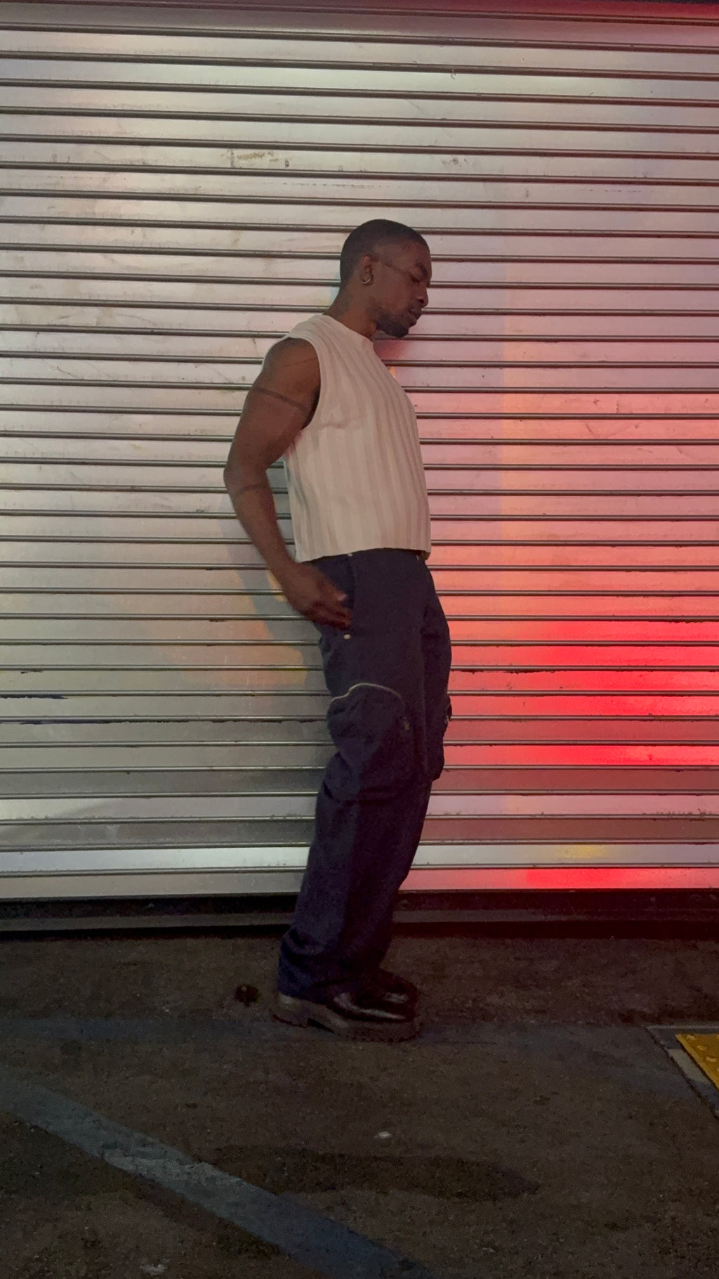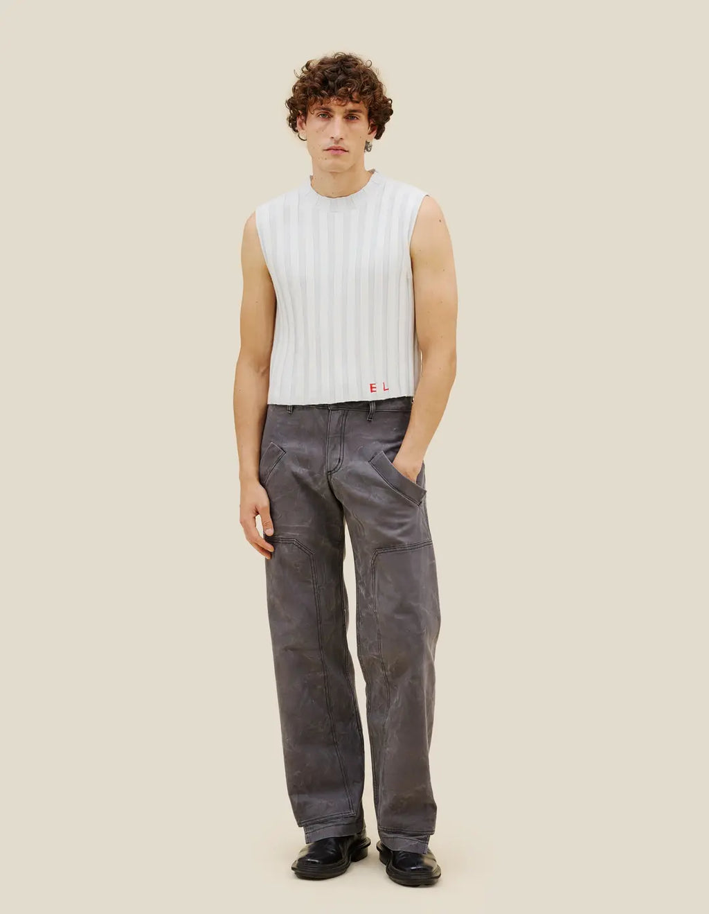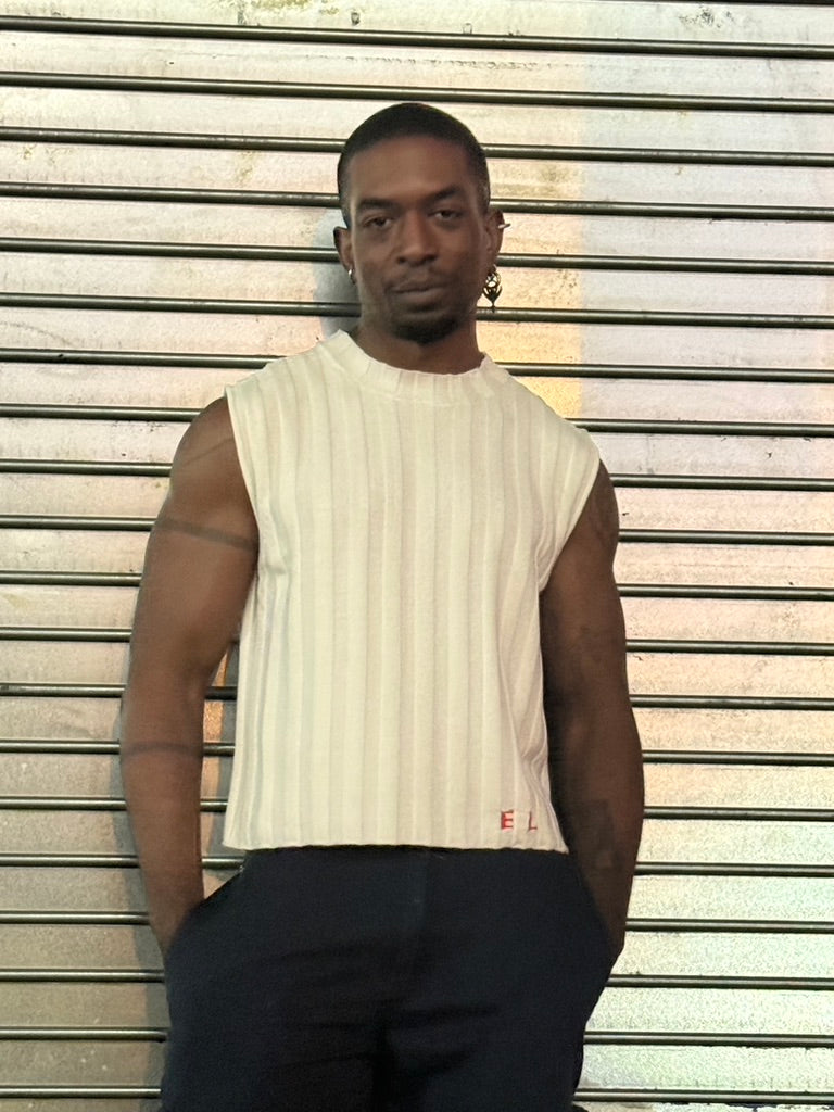 Boxy crewneck vest in 10x10 merino wool rib, featuring a contrast stripe across the body and an intarsia-knit red EL logo.