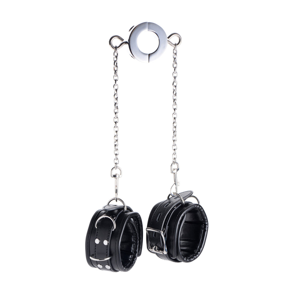 The ankle cuffs can be adjusted to find the perfect fit and feature three D-ring attachment points to fasten your choice of restraints to lock them down further! The ankle cuffs feature locking buckles if you choose to add your favorite padlock into the mix. The Ball stretcher ring features additional attachment points for more weights or more restraints - experiment with your lover and see how far you can stretch their limits!
