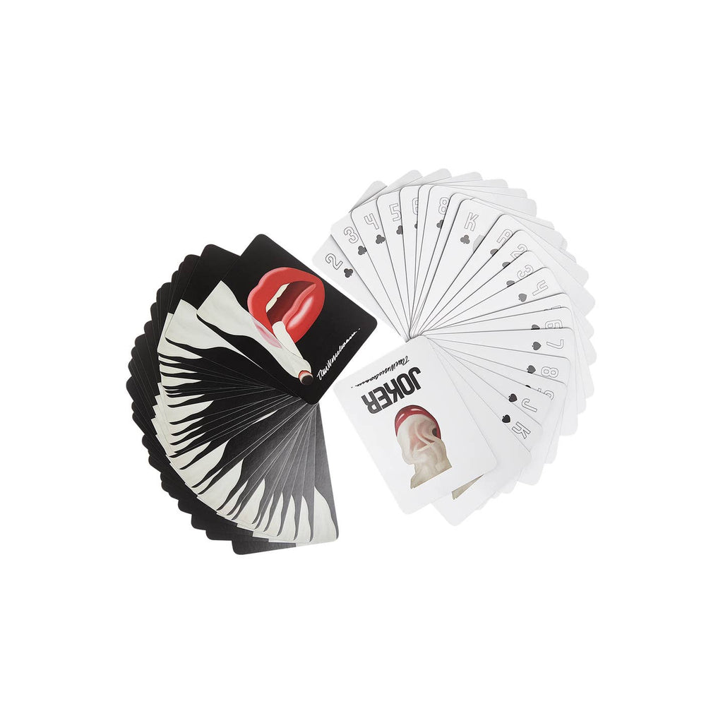 This playing card deck features one of Tom Wesselmann’s most iconic pieces of art, Smoker 1 (Mouth 12) from 1967. The mouth is seen in the center of the box, against a black background. The font used on the cards was designed by Claire Wesselmann, the artist's wife, when she prepared the layout for the Tom Wesselmann monograph published by Abrams (Abbeville Press) in 1980.