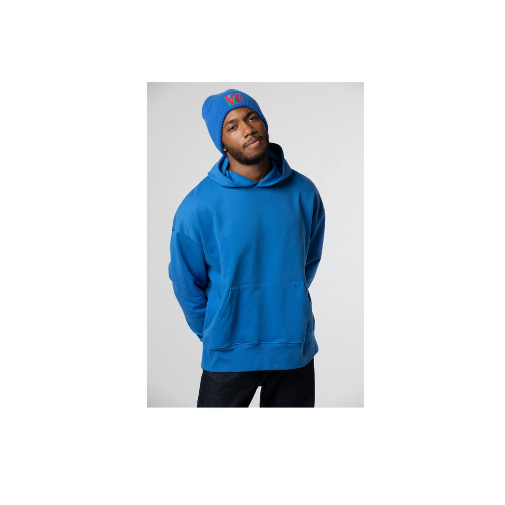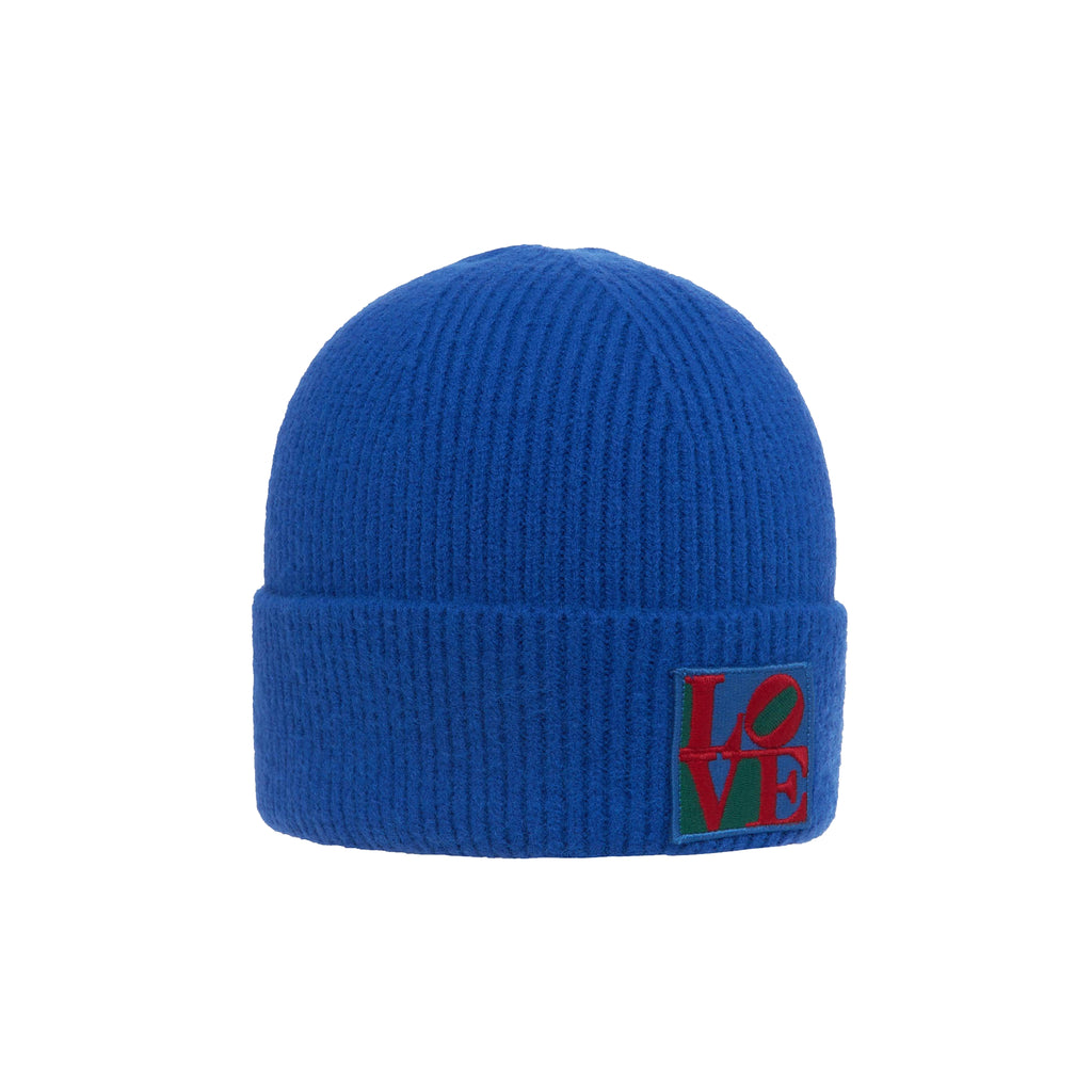 Our wide-knit beanie stays true to Robert Indiana’s color palette in a Cerulean blue with his iconic LOVE artwork as a patch on the front.