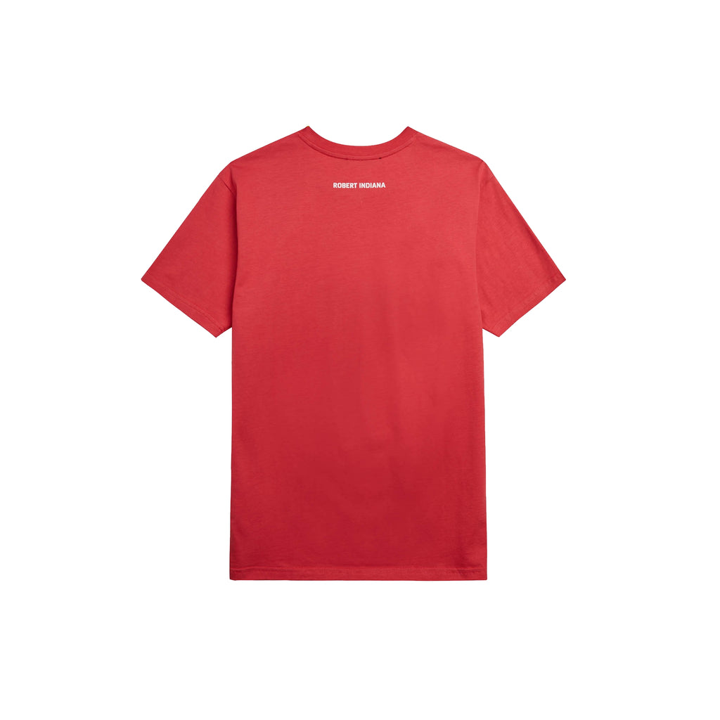 One of the best-known artworks in the world, Robert Indiana’s LOVE is printed on this soft blue t-shirt true to the artist’s vibrant color palette. “Robert Indiana” is printed in white as if stenciled on the left sleeve. 100% combed cotton jersey in blue.
