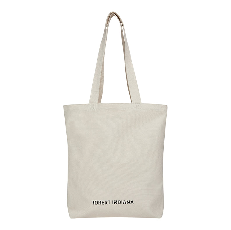 Our oversized, heavyweight duck canvas tote bag features Robert Indiana’s beloved LOVE on one side with Robert Indiana's name branded on the back. The stone colored bag features a top handle strap and an interior zippered pocket.