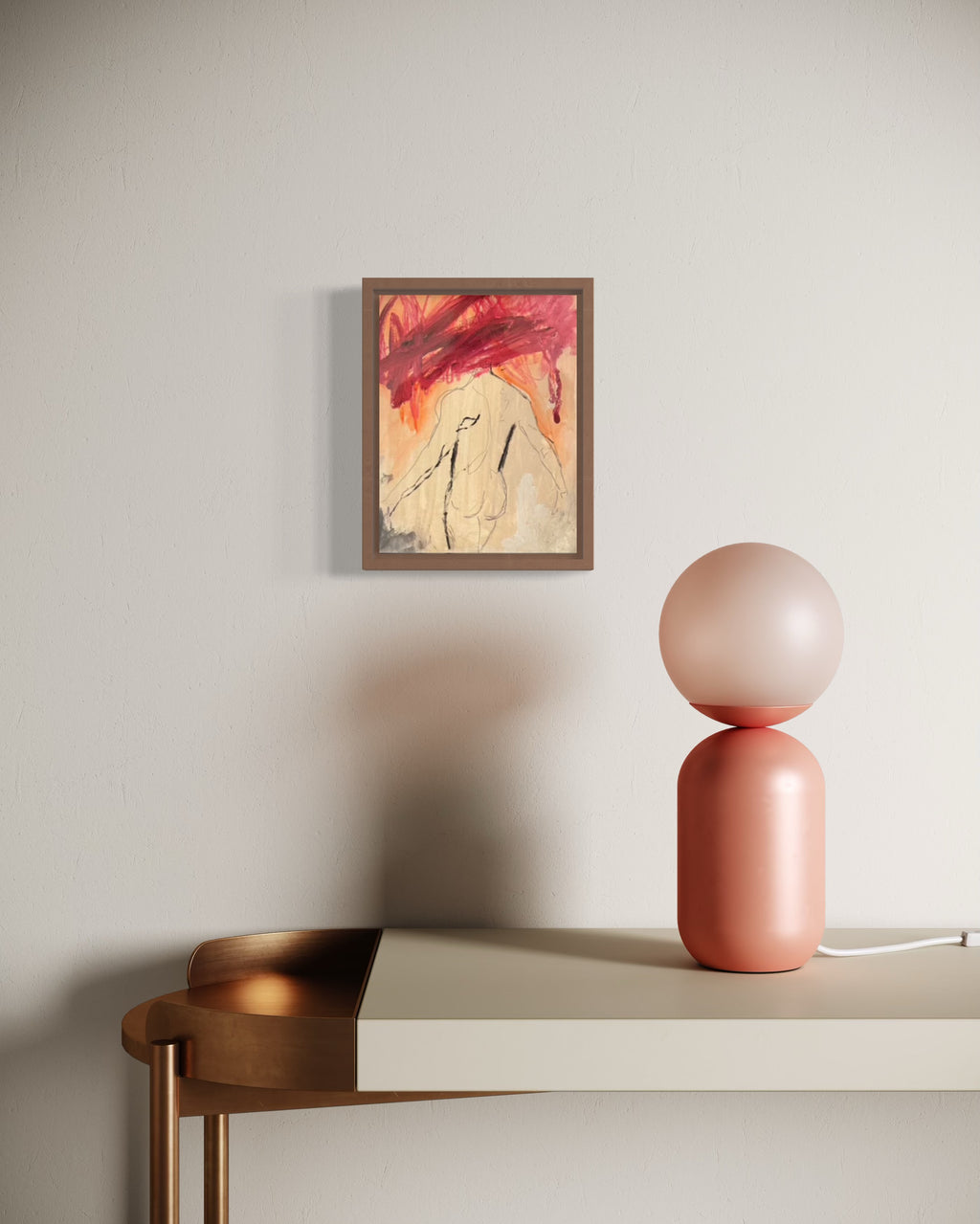 "A self-portrait in spare black lines, the body breaking beneath a streak of furious red paint. It marks the fury and release of a sexual awakening — raw, eruptive, and impossible to hold back — as the artist emerges from the weight of a repressive religion. The ornate 19th-century gilded frame holds the work like a relic, its old-world restraint clashing with the immediacy of the image. That tension becomes the story: a self once confined, now erupting past every boundary."